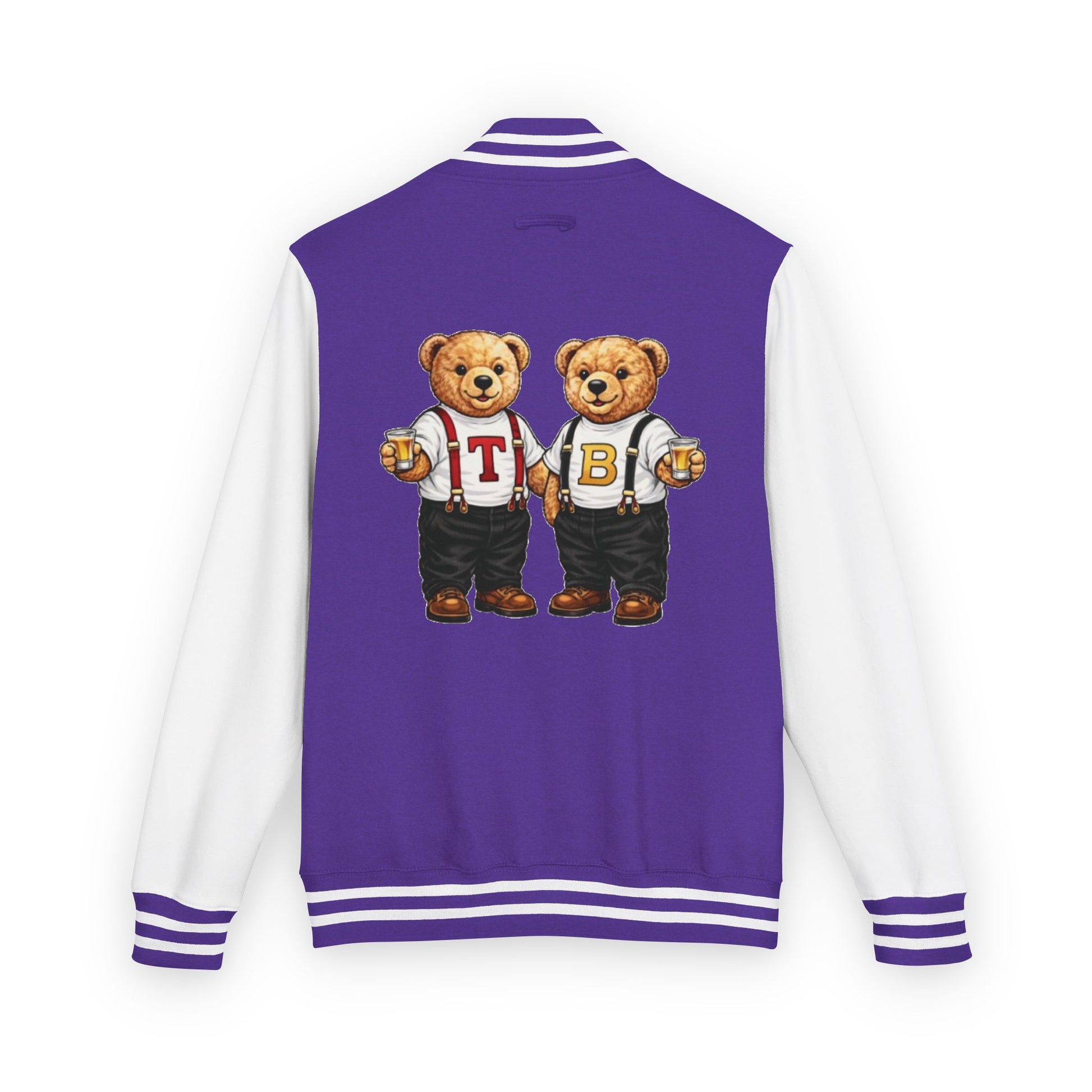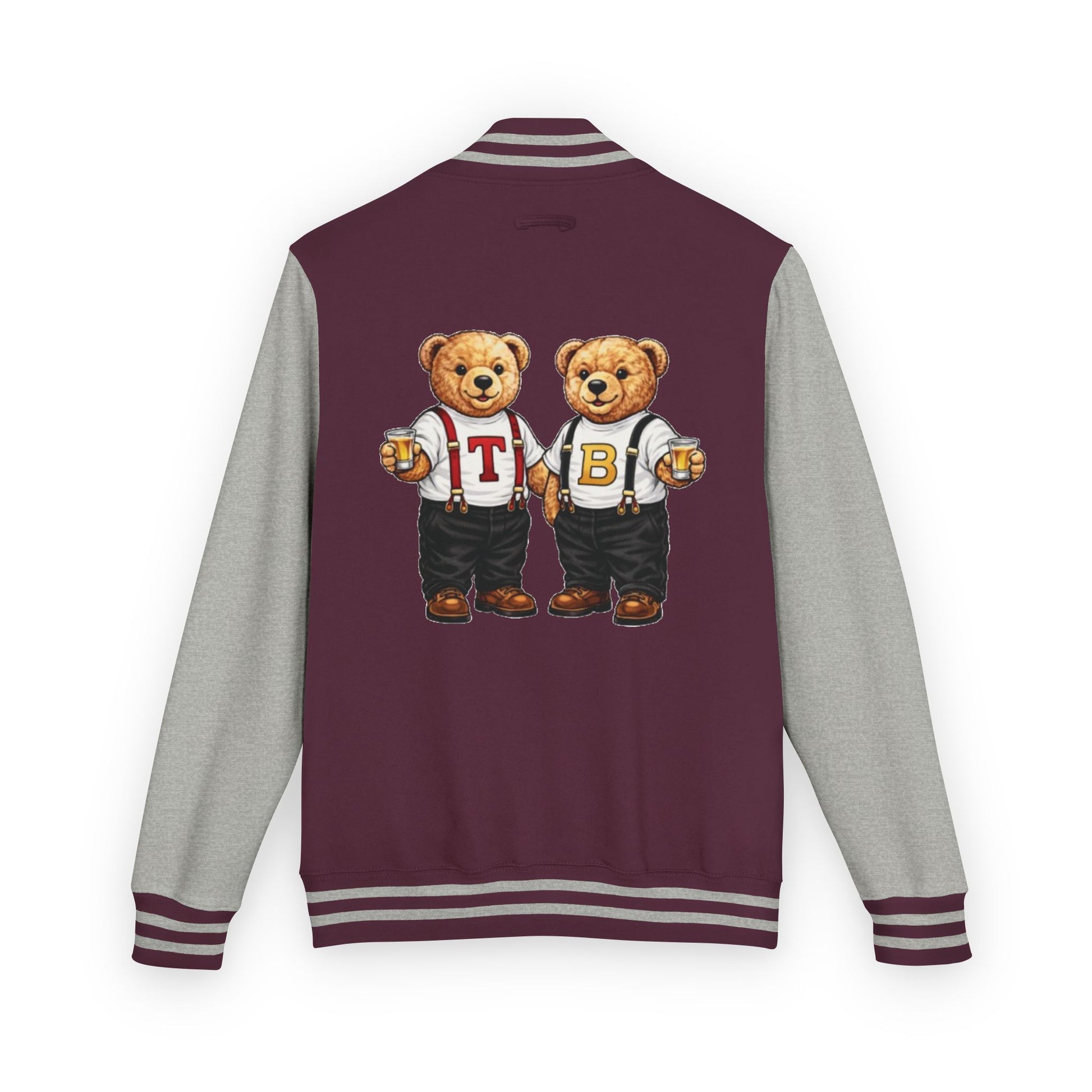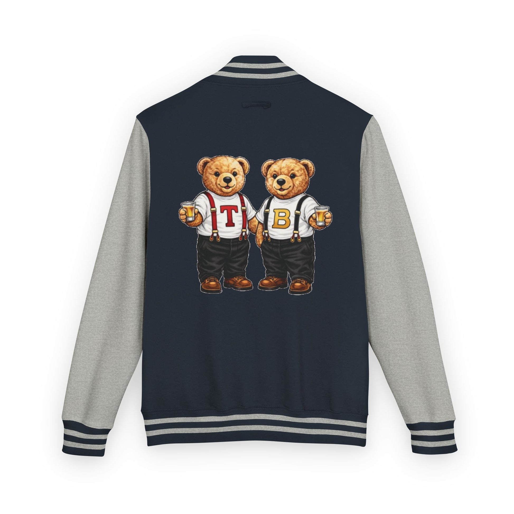 This vintage-inspired letterman jacket carries a playful, nostalgic energy — soft to the touch and built like a classic varsity piece. The front features a subtle crest, while the back shows two charming teddy bears holding drinks, bringing warmth and a wink of humor to chilly evenings. The garment-dyed finish gives each jacket a lived-in color and texture that deepens with wear. Wear it to gatherings when you want to feel familiar and relaxed, or slip it on for evening walks where the embroidered crest and back artwork start conversations. The medium-heavy weight keeps you cozy without bulk, and the sewn-in label and quality construction make it feel made-to-last.